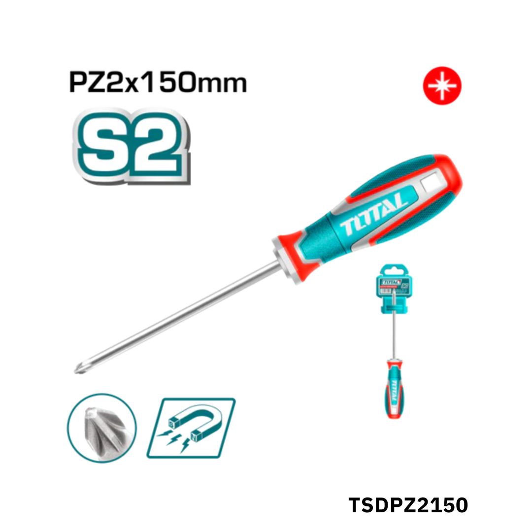 Le tournevis TOTAL TSDPZ2150 PZ2 de 150 mm est conçu pour offrir précision et confort d’utilisation grâce à sa lame en acier S2 haute résistance et sa pointe Pozidriv PZ2 magnétique assurant une excellente tenue des vis, avec une longueur de lame de 150 mm et un diamètre de 6,0 mm, il permet d’atteindre facilement les zones profondes tout en garantissant une transmission efficace du couple, sa tige ronde et son manche ergonomique tricolore assurent une prise en main confortable et sécurisée, même lors d’un usage prolongé, il est également doté d’une aimantation puissante facilitant le maintien des vis, et est livré avec un cintre en plastique pour un rangement pratique et une présentation soignée.